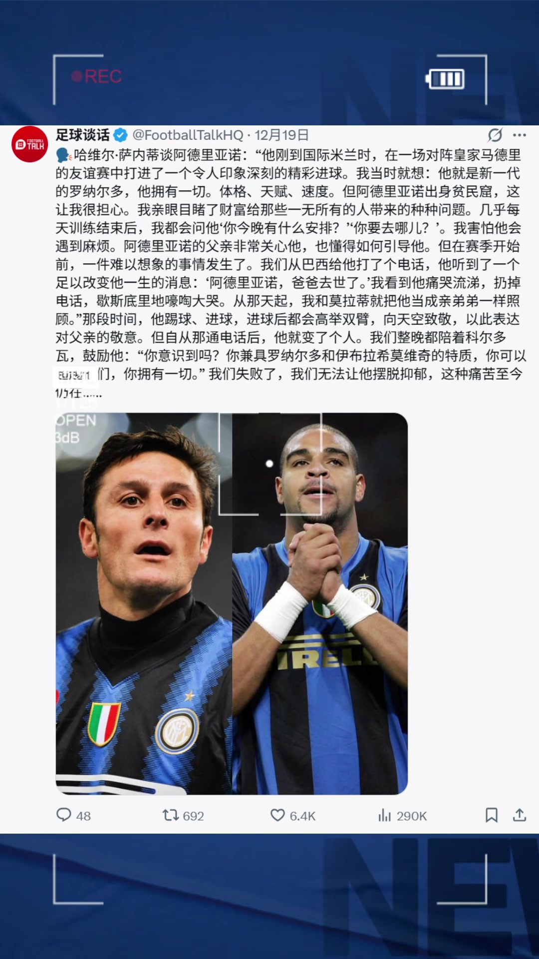 萨内蒂:得知父亲去世阿德嚎啕大哭,从此我把他当亲弟弟一样照顾
